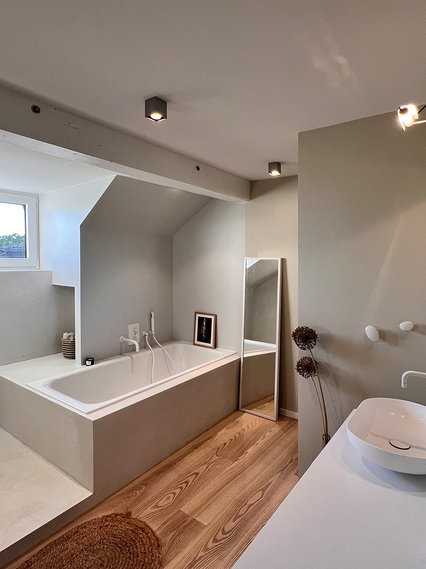 Nachher: Ein sehr aufgeräumtes Bad in harmonischen Farben, perfekter Raumausnutzung. Das Zusammenspiel aus fugenlosem Putz, abwaschbarer Wandfarbe und Holzboden macht es so richtig gemütlich.